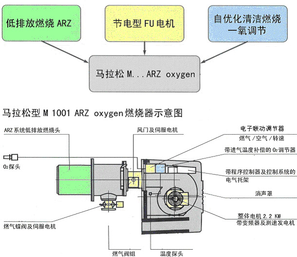 · 节电。通过无级转速调节实现(见下) · 自优化稳定燃烧,通过监测空气中O2的含量,可节省5%的燃料 · 锅炉制造商的理想选择 · 安装现场无需进行电控箱接线 · 无电磁发射问题(EMV ) · 节省空间和费用 · 调试简单、快速 · 工作宁静 5 MW以下马拉松 oxygen型燃烧器提供全套装置,包括: · 电机带内置式变频器 · 电子联动式调节器 · 废气中O2含量优化调节 |